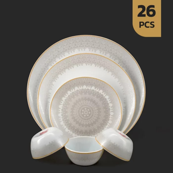 ۲۵ پارچه ۶ عدد بشقاب پلوخوری، ۶ عدد خورشتخوری، ۶ عدد پیشدستی، ۶ عدد پیاله ماست/ترشی، ۱ عدد دیس بزرگ
