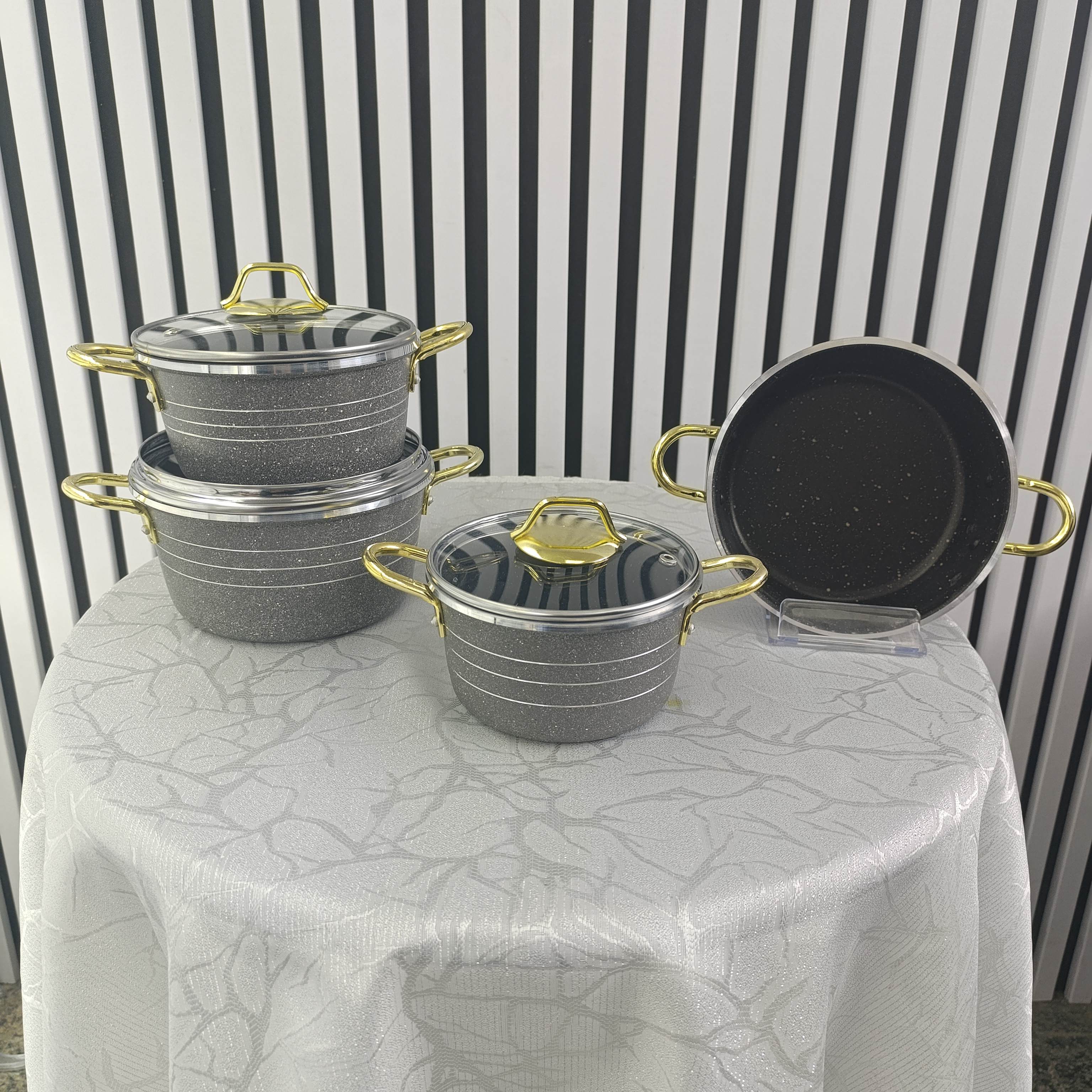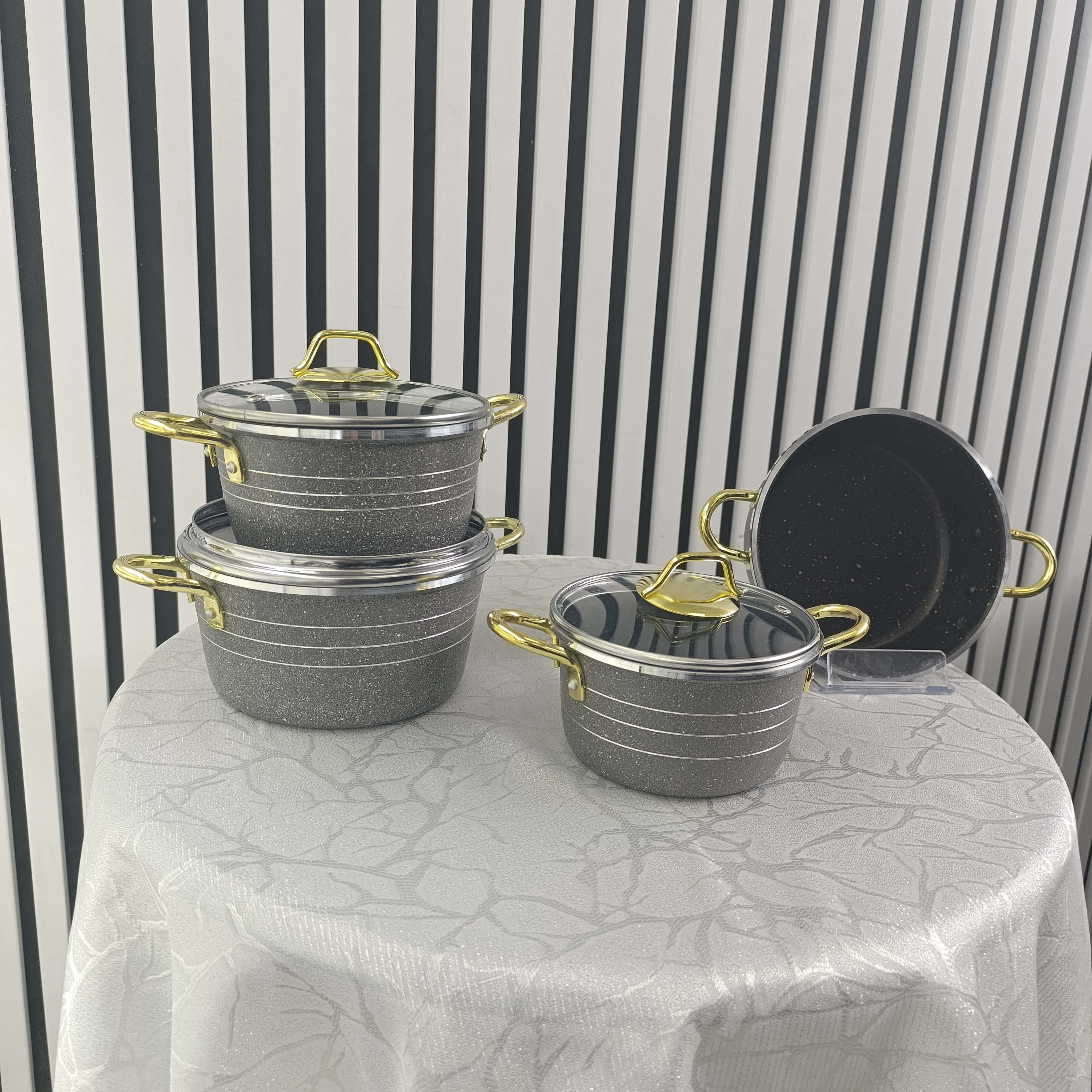 این ست شامل سه قابلمه در سایزهای ۱۸، ۱۶ و ۱۴ سانتیمتر به همراه درب و یک ماهیتابه ۱۸ سانتیمتری است که میتوان از درب قابلمه برای آن نیز استفاده کرد.